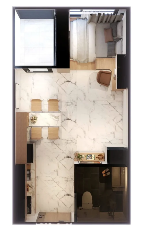 Thi công nội thất Căn hộ 1 phòng ngủ được thiết kế theo tinh thần “Less is More” – giảm chi tiết, tăng công năng.